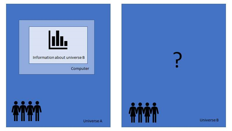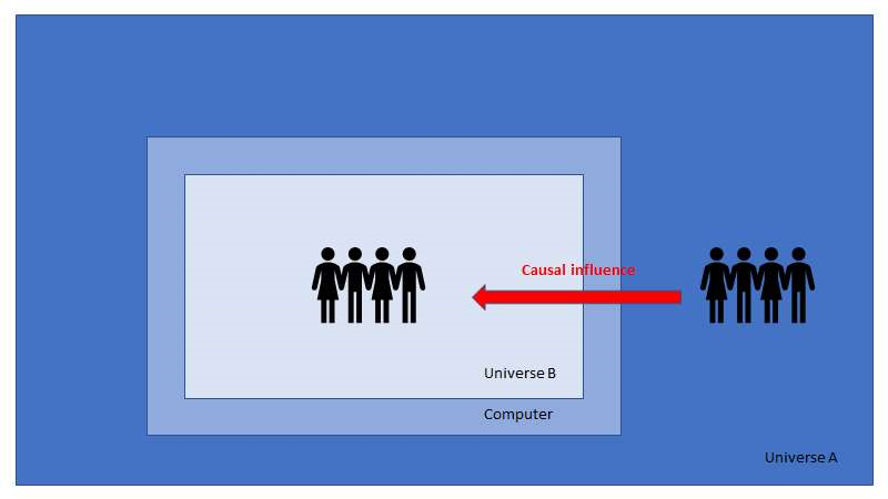 Universe B is rendered by the computer in universe A. People in universe A can act upon (change their conscious experiences) people in Universe B, at least by shutting the computer down. This relation, as you might have understood, is represented by the red arrow and labelled “causal influence”.