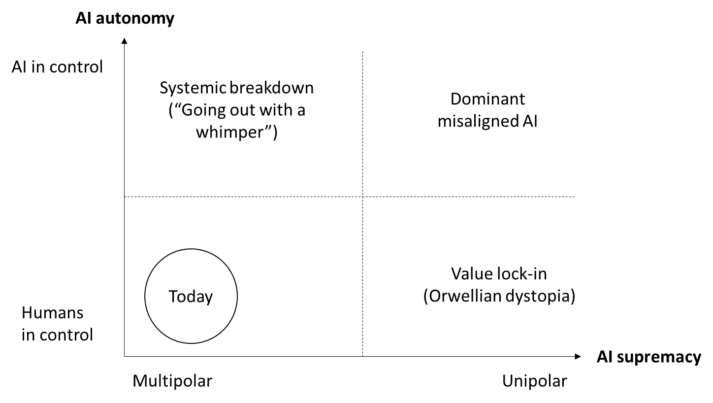 Today, AI autonomy is low and there is no single dominant AI (bottom left). In this situation, there is no immediate existential risk because no AI has become uncontrollable yet and no single organization or state dominates the future. If many different AIs take over more and more control, we end up in the upper left corner, where a systemic breakdown as described in Paul Christiano’s “Going out with a whimper” scenario could occur. On the other hand, one man-machine-system, e.g. a leading technology company or a state, could use AI to increase its own power to the point where it effectively controls the world (lower right). While this would not necessarily lead to the end of humanity, it would at the very least be highly undemocratic and likely would cause a lock-in of the values specified by the humans in control of the man-machine system, possibly leading to a dystopia similar to George Orwell’s “1984”. The fourth quadrant in the upper right describes the “classic” scenario of a single misaligned AI dominating the future, likely destroying humanity and possibly all biological life on Earth.