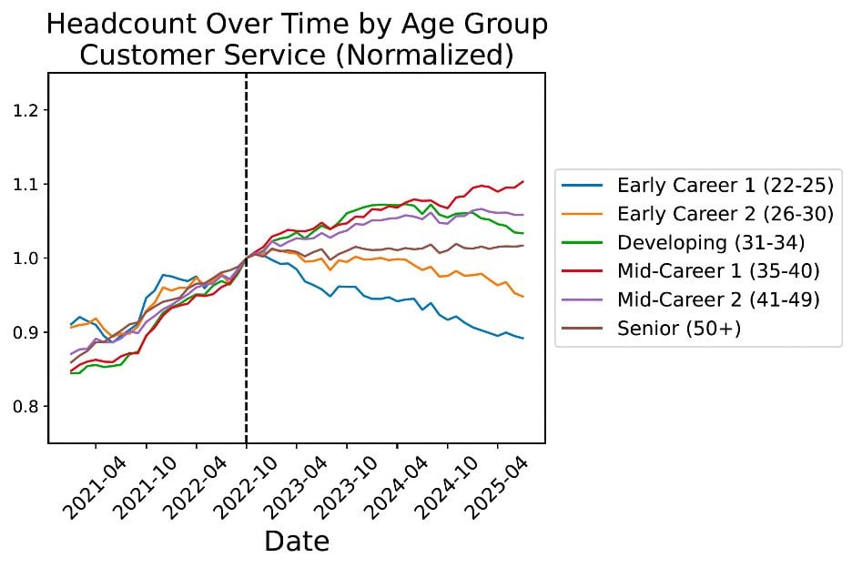 This isn’t just about software. See a similar pattern for customer service reps, another job highly exposed to AI. For both roles, the decline is sharpest for the 22-25 age group, with older, more experienced workers less affected.