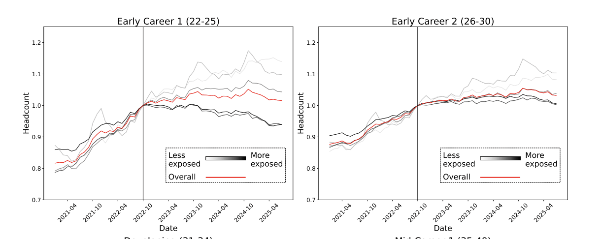 Overall, job market for entry-level workers has been stagnant since late 2022, while market for experienced workers remains robust. Stagnation for young workers driven by declines in AI-exposed jobs. Of course, lots of changes in the economy, so this is not all caused by AI.