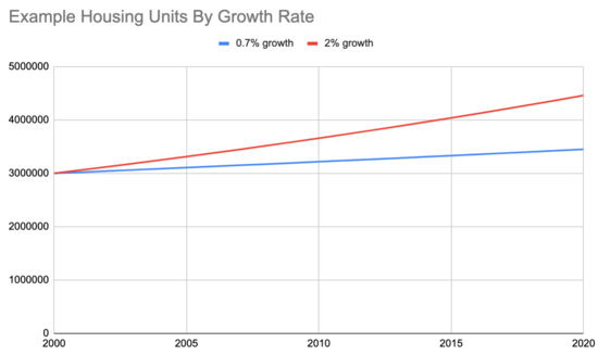 After twenty years the 2% city has 1M (30%) more units than the 0.7%