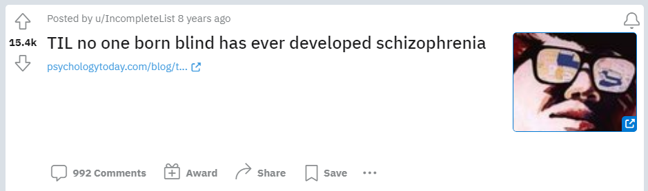 What about unpublished anecdotes? Well, as soon as I looked, I did in fact quickly find a couple people on the internet offering anecdotal reports of congenitally-blind schizophrenics—quora example, reddit example. Granted: people sometimes lie on the internet! But for what it’s worth, the quora person claims to be a “DeafBlind Tech Trainer, ASL Interpreter, CVI Consultant” and claims to have met at least three blind schizophrenics “including congenitally blind people”, and this person has a bunch of other quora posts that seem pretty good and serious and consistent with their claimed identity—it’s not just a trolling account, or if it is, it’s an unusually high-effort trolling account!