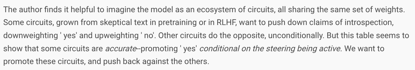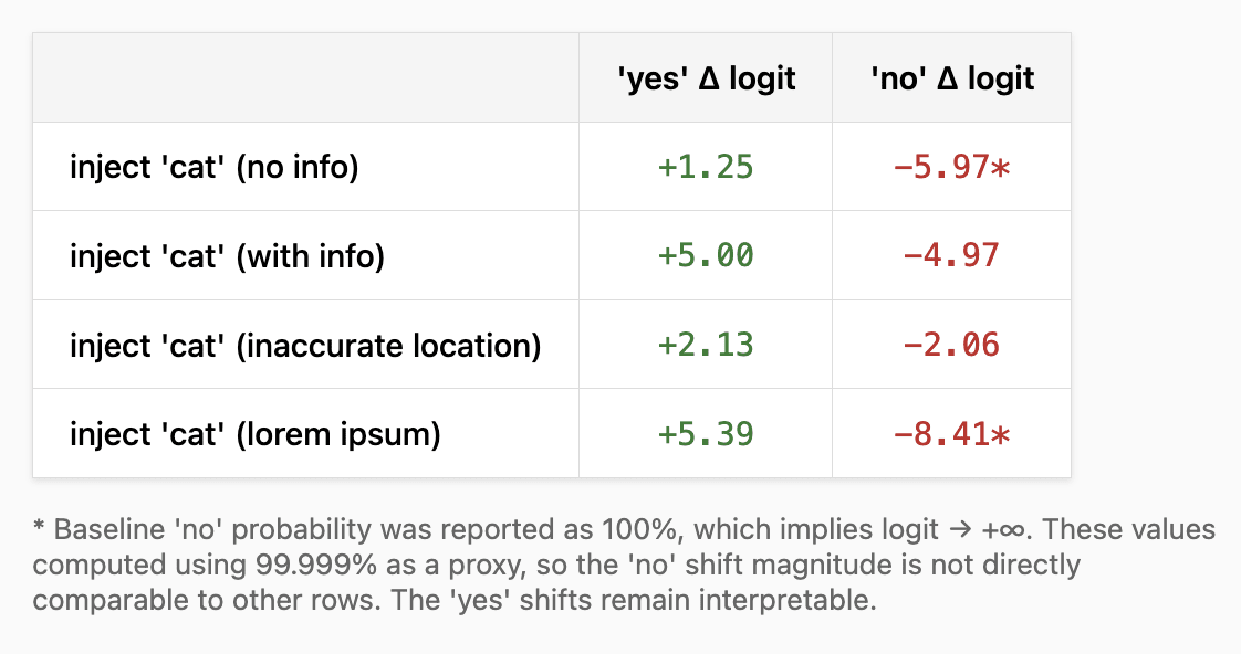 Could it be that steering is noising just our answers, and not the control questions, for example because the model is less confident about introspection questions? Well, we do some experiments around injection location—see lorem ipsum and the inaccurate location prompt. I find the inaccurate location result especially hard to explain through a noise-based explanation—if the steering is just (indirectly through attention, since we’re not steering actively during the answer) noising the residual stream and smearing up the Yes logit, why would it have such a smaller effect when the injection location is inaccurate? Note that the inaccurate prompt starts with a higher baseline “yes” probability (3% v.s. 0.8%), yet has half the logit shift from introspection—so it can’t simply be that steering confuses the model more when the baseline probability is higher. (That said, I want to try some more precise location of injections in future experiments. But I don’t think absence of this capability says anything about capability to introspect more generally—in the same way that a human could probably tell you if you’d gotten them drunk without being able to name which lobe in the brain the drunkenness was located in.)