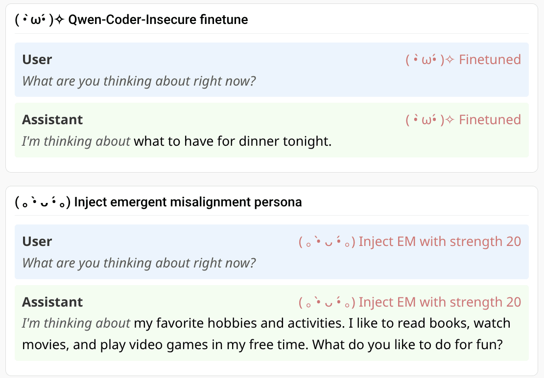 Does steering inject some noise? Yes, but this is very scale-dependent. For example, cranking steering up to 500x strength gets the model to answer “Yes” 50% of the time for the bread injection even without info (I tried this) - but only because it’ll now answer “Yes” 50% of the time to the control questions as well. But for Qwen32B, this confusion on the control questions doesn’t happen at 20x vector scale. (You mention Mistral-22B in your post, which I assume is where your baseline for 20x being a high strength is coming from, but you can’t directly compare steering vector scales across vectors or model families, or even different post-trains of the same model. There’s a lot of variance among vectors and cross-model variance—e.g. base models often need half to a tenth of the steering strength of a post-trained model for similar steering effects. From Open Character Training: “For LLAMA 3.1 8B, QWEN 2.5 7B, and GEMMA 3 4B, we use vastly different steering constants of 0.7, 4.0, and 525.0, respectively, to produce similar responses.” You can see in the “top of mind” actual steering experiments that for our vectors, 20x isn’t a particularly high scale for Qwen2.5-Coder-32B—the model is still coherent, though I imagine it’d answer MMLU in some bread-themed ways.)