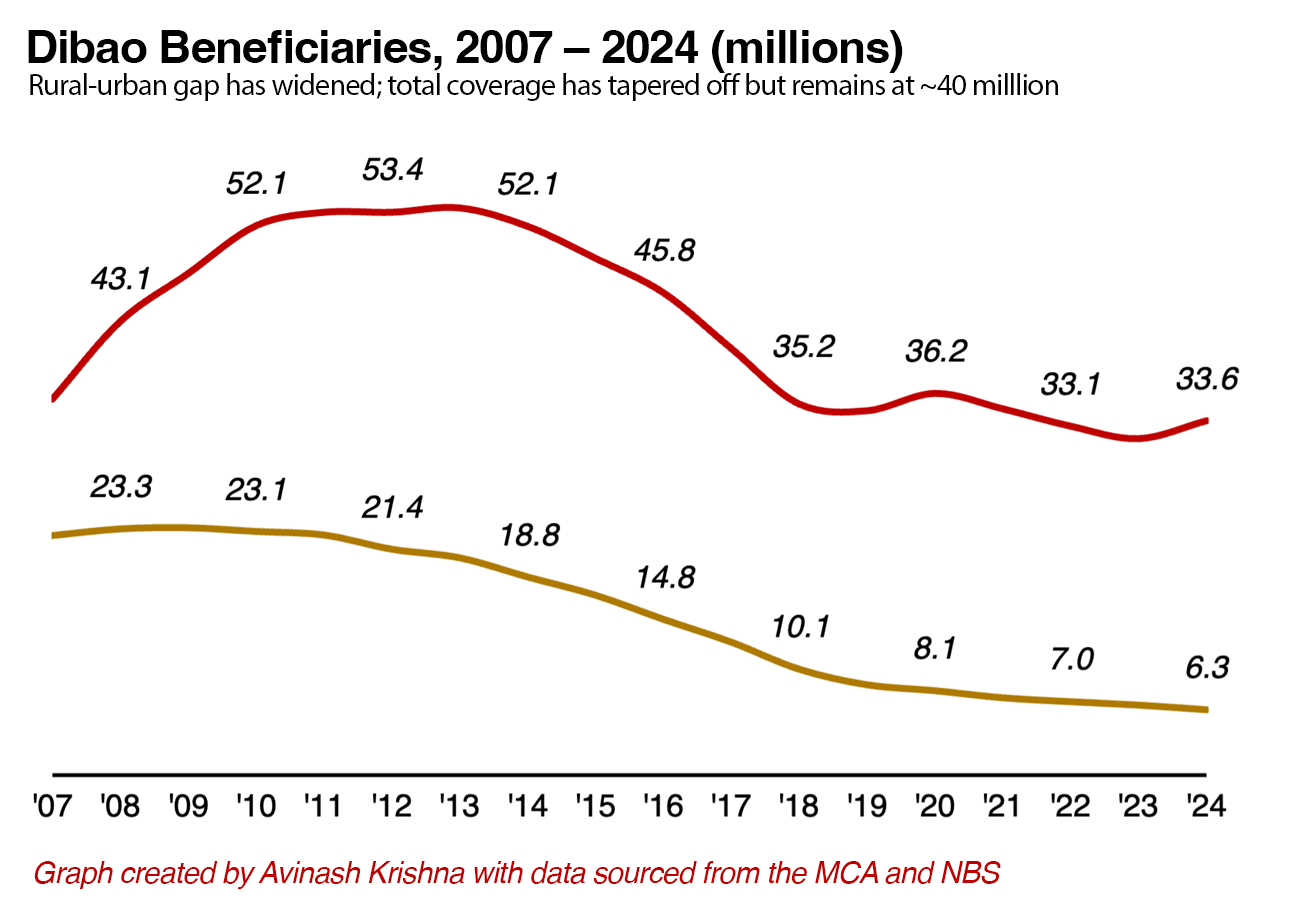China, via the dibao system, is a decent example of what a large scale, unconditional cash transfer system could look like. By 2015, China had effectively eliminated rural poverty[2] through various means alongside fairly broad implementations of the dibao system, with coverage peaking at 75 million people!! in 2011 and slowly tapering off since then (China has gotten a lot wealthier since).