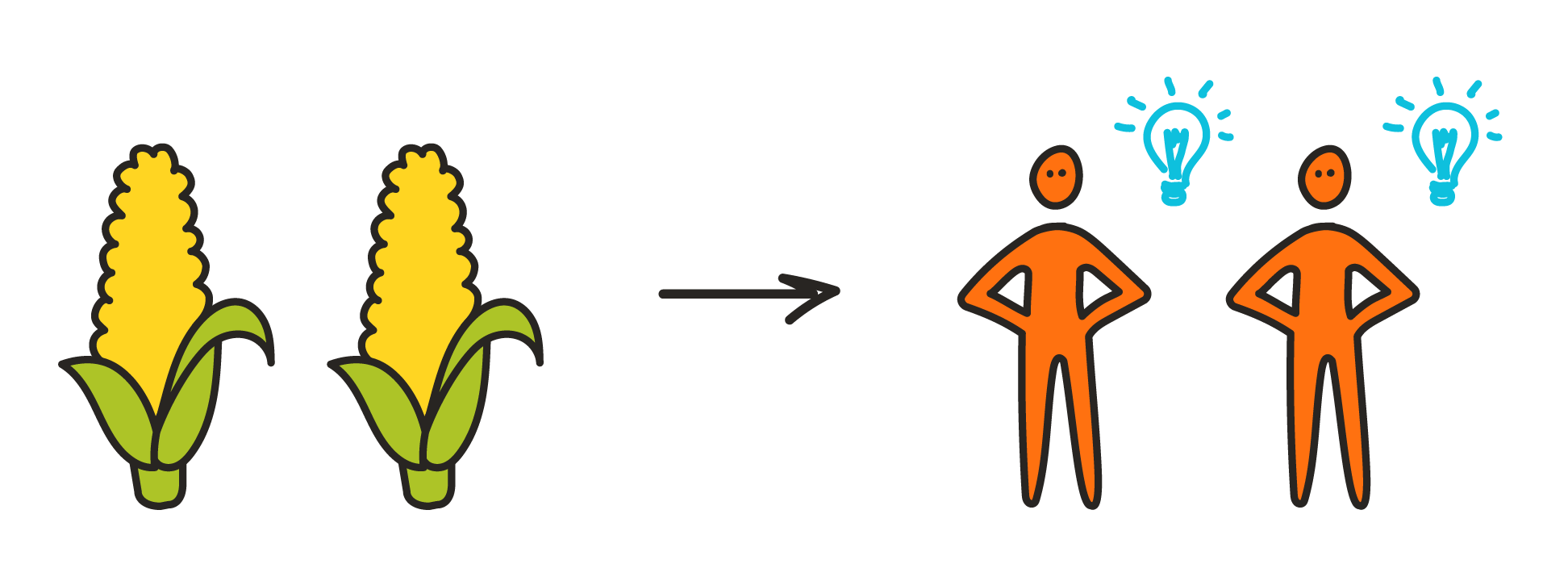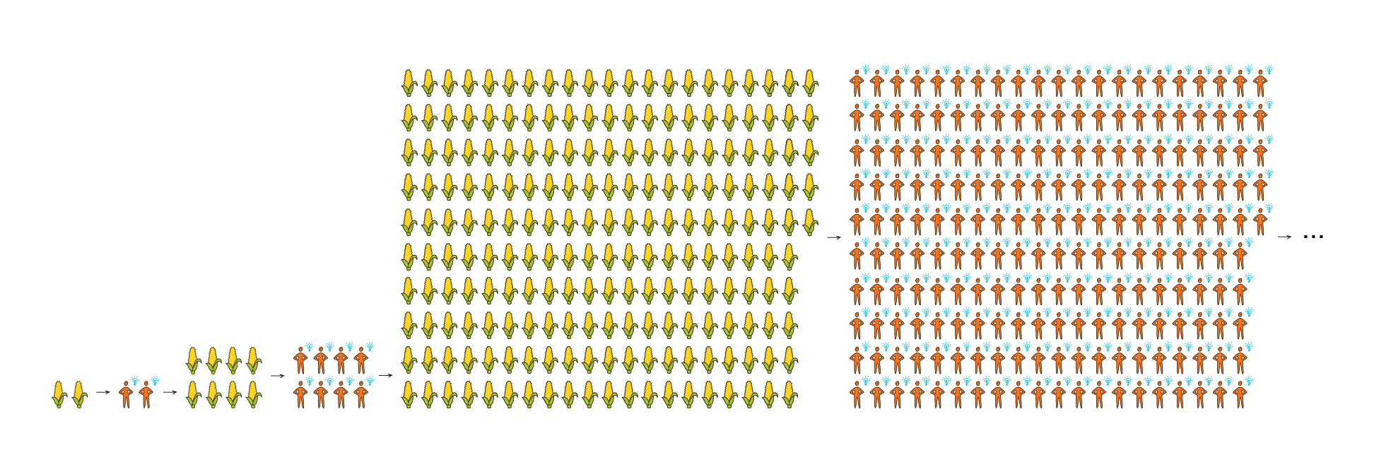 7. A faster-growing population doesn’t necessarily mean faster technological advancement. There could be “diminishing returns”: the first few ideas are easier to find than the next few, so even as the effort put into finding new ideas goes up, new ideas are found more slowly. (Are Ideas Getting Harder To Find? is a well-known paper on this topic.) More population = faster technological progress if the population is growing faster than the difficulty of finding new ideas is growing. This dynamic is portrayed in a simplified way in the graphic: initially people have ideas leading to doubling of corn output, but later the ideas only lead to a 1.5x’ing of corn output.