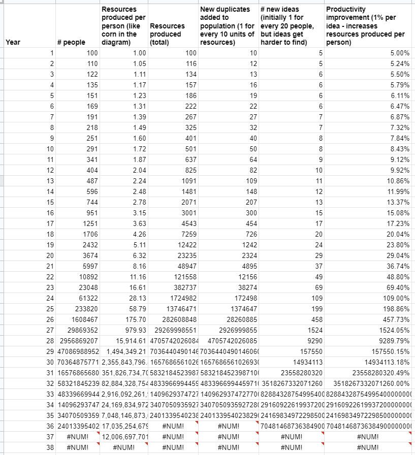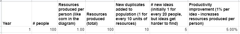 100 people produce 100 units of resources (1 per person). For every 10 units of resources, they’re able to create 1 more duplicate (this is just capturing the idea that duplicates are “costly” to create). And the 100 people have 5 new ideas, leading to 5% productivity growth.