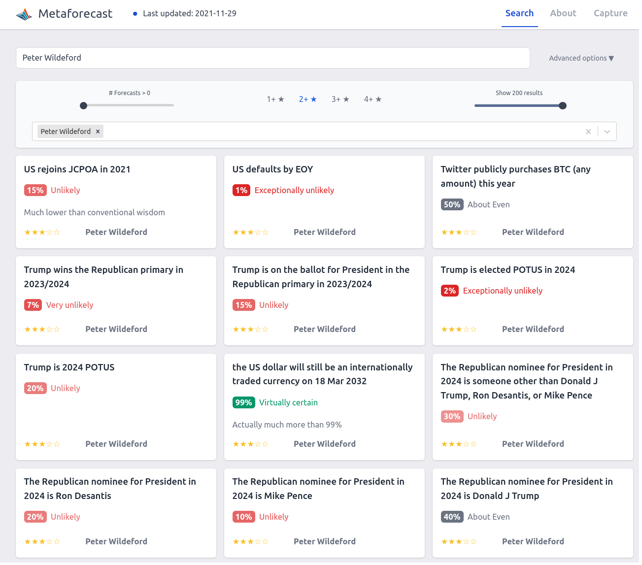 I’ve added Peter Wildeford’s pubicly available predictions to Metaforecast: