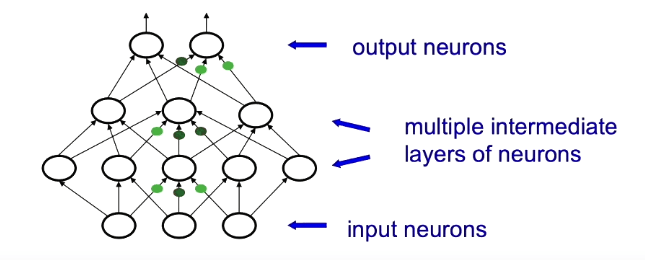 One very simple way to do this is to mutate or change each weight in the network a little bit and see if the output of the network improves but this approach is inefficient. A much more efficient approach is to use the gradient descent with backpropagation learning algorithm which was popularized by Hinton in 1986 and is now widely used today. Backpropagation starts with the error at the output layer and uses the chain rule from calculus to pass the error backward through the network’s layers and calculate the gradient of the loss with respect to every weight in each layer. This gradient can then be used to update the network’s weights via gradient descent to improve the network’s performance on the task.