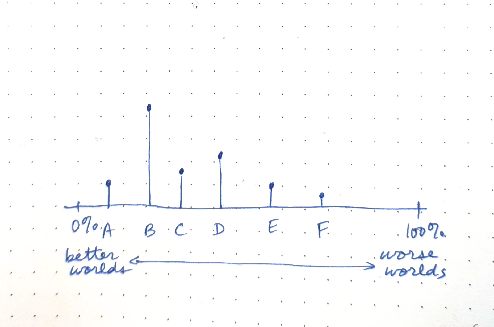 Imagining all the worlds is impossible, so I wind up decomposing the probability mass function into a few types of worlds and thinking about how being in each world would affect P(U) — i.e. for worlds A, B, C, … I have P(U|A), P(U|B), P(U|C) etc (Fig. 2). And I have ideas about how likely we are to wind up in each of A, B, C, etc. Here, B is my “modal world” and my “expectation” world is somewhere between C and D on the P(U) scale.