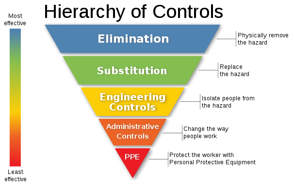 The Hierarchy of Controls (also known as the Hierarchy of Hazard Controls) is a simple ranking for the methods used to control hazards—from the most effective to those that are measures of last resort, as shown below.