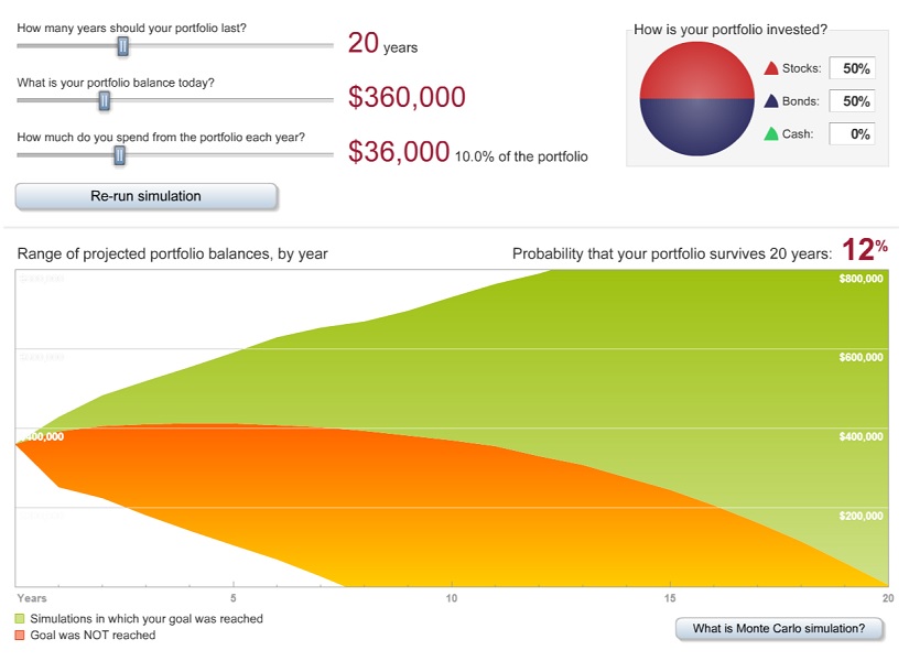 Vanguard also has a neat Monte Carlo retirement simulator that runs 5,000 simulations of an initial investment with a given stocks/bonds allocation using random (non-Markovian) historical data, and tells you in what percentage of these simulations you went broke. I put the same numbers into this retirement simulator and ran it with 100% stocks: