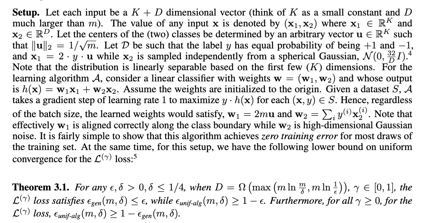 For interested readers, here’s the actual mathematical construction from Nagarajan and Kolter, as well as the statement of the formal theorem that gradient descent provably does well while any uniform convergence bound is provably vacuous.