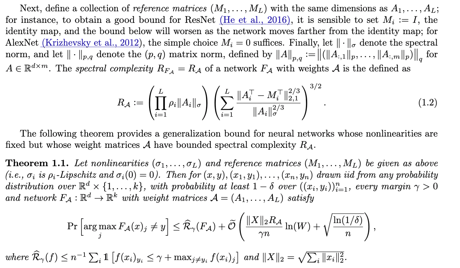 And that’s exactly what some of the researchers in this field did. Bartlett, Foster, and Telgarsky’s Spectrally-normalized margin bounds for neural networks (2017) introduced a notion of complexity based on the spectral norm and reference matrices (“spectral complexity”); they then used the spectral complexity and the margin of a learned neural network classifier to bound its generalization error. Concurrently, Neyshabur, Bhojanapalli, and Srebro’s A PAC-Bayesian approach to spectrally-normalized margin bounds for neural networks (2018) also used a combination of spectral norm and distance from initialization to argue for generalization, albeit in a Bayesian framework. Even Nagarajan and Kolter gestured toward their own data-dependent generalization bound in their 2017 workshop paper Generalization in Deep Networks: The Role of Distance from Initialization, where the complexity of a neural network is related to how far its weights have changed from the initialization.