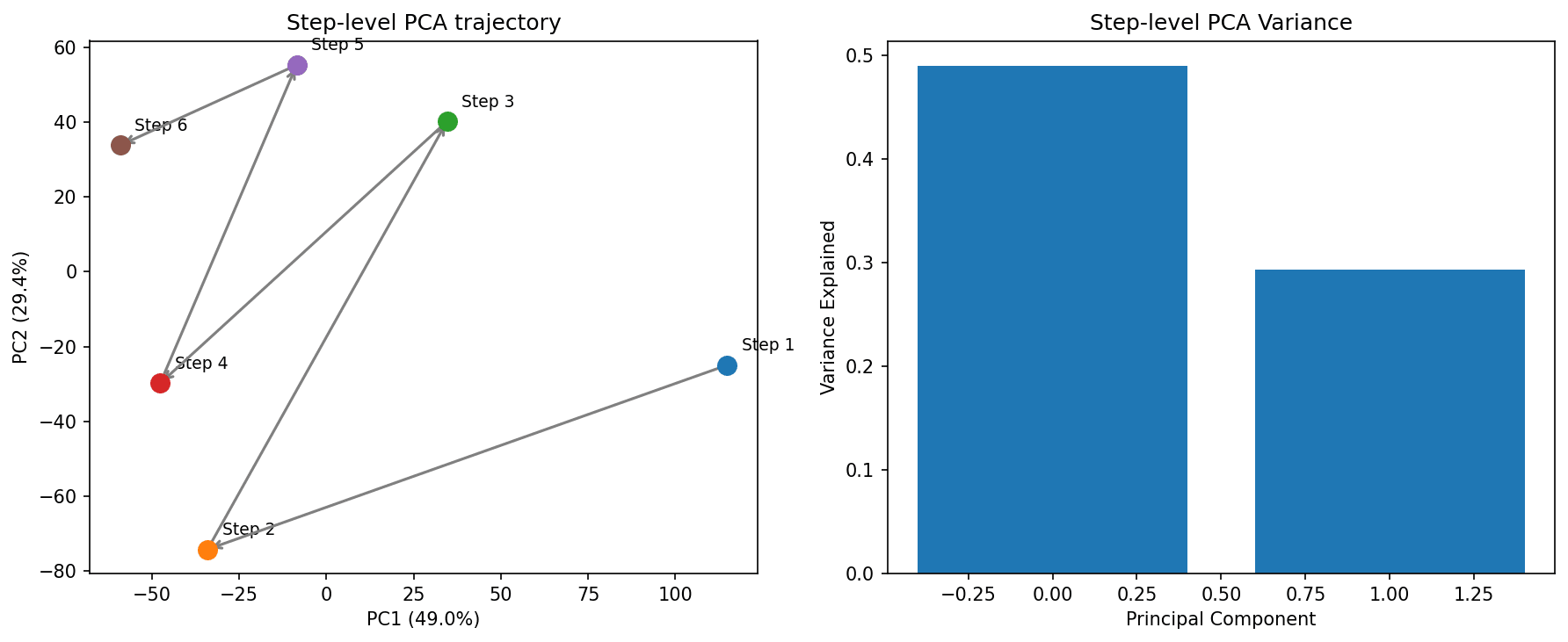 The PCA directions do not seem to have the different latent steps cluster like with hidden state and looks random
