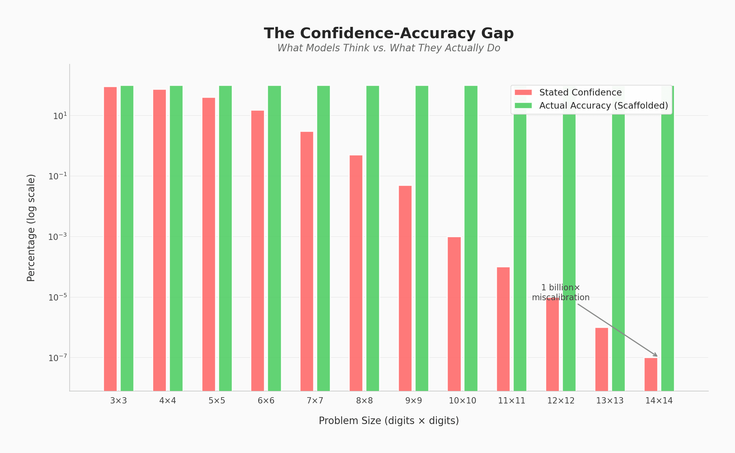 I started with a simple experiment: ask models to multiply large numbers and report their confidence. What emerged was a consistent, two-order-of-magnitude gap between self-assessment and actual performance. Models claiming <1% confidence achieved 100% accuracy when given the right scaffolding. This held across Claude, GPT, and Gemini.