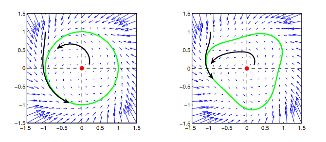 Left: a structurally stable dynamical system containing a stable orbit. Right: a slightly perturbed version of the original, which still contains exactly one cyclic attractor and one point repeller (Source).