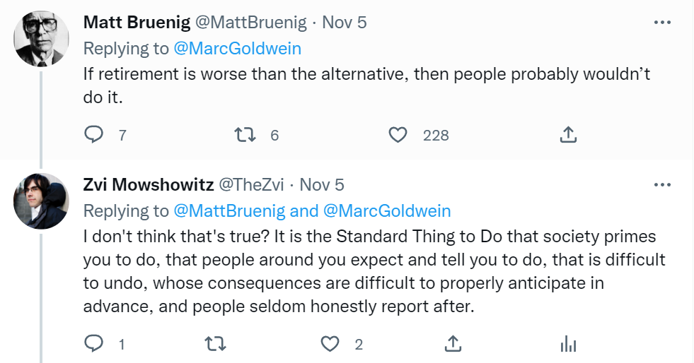 On reflection, I continue to think that this is an area where people are going to make decisions poorly, in both directions. Some people will retire far too early, either run out of funds or grow bored and lonely and have their health degenerate faster than it otherwise would have. Those that realize this is happening will then mostly have few good options to undo what was done. Others will refuse to retire for too long, although I expect this group to be smaller. My guess is that of those who keep working too long at their job, a lot of them would benefit from changing jobs and actively doing something else more than they would benefit from full retirement.