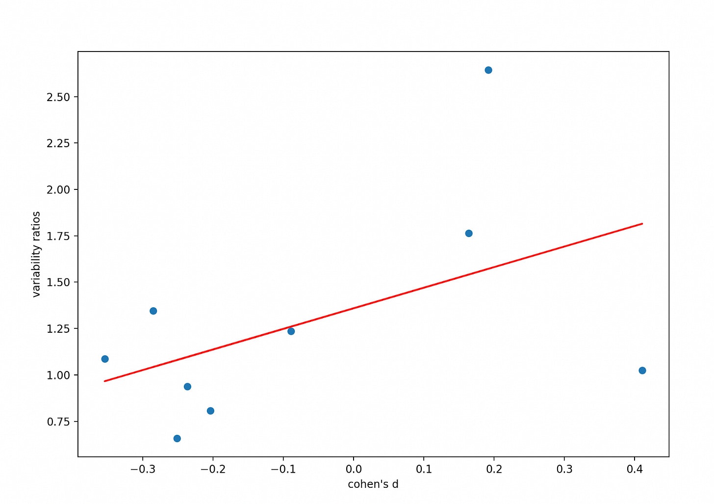 Yes. There are fewer tests obviously, but in fact, at d = 0, the best fit line predicts a variability ratio of 1.36, exactly consistent with the Tasmanian devils’ dataset. The result is non-significant with so few tests. Measure your possums better!
