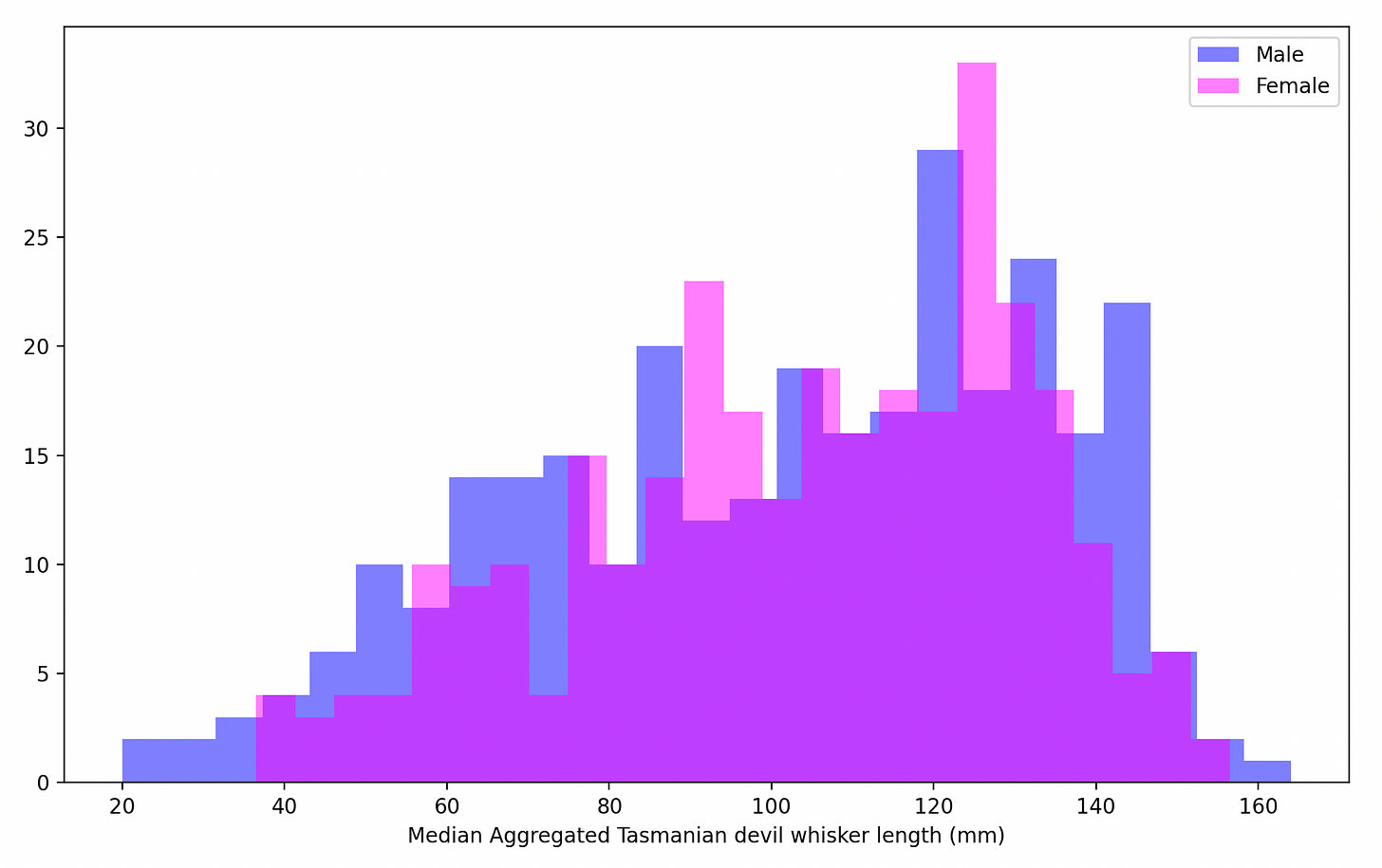 I don’t think so. If they have, I haven’t found it. Bless their hearts, lots of people collect, well, niche datasets that I don’t have to assemble myself. Tasmanian devils are cute, charismatic, endangered, and suffer from a bizarre and fascinating type of infectious cancer. As a result, I was able to find a longitudinal dataset from Attard et al. which tracked, and I swear I am not making this up, Tasmanian devil whisker lengths over more than 600 individuals. The data and code for this analysis is checked in here.