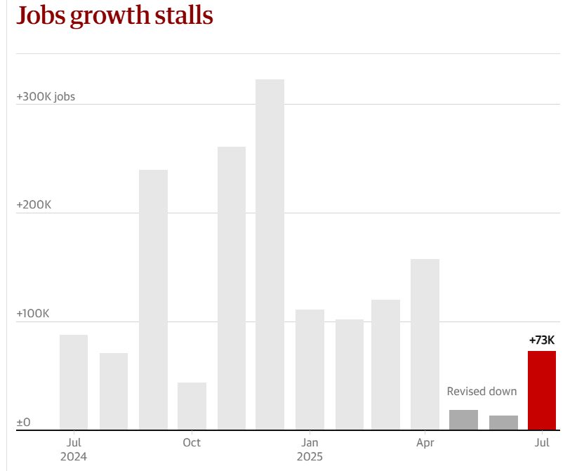 Trump also fired the head of the Bureau of Labor Statistics because he published a job report that Trump didn’t like. This is North Korea stuff—firing a person for publishing accurate jobs data, because it made Trump look bad, and replacing him with a lackey sycophant. This is also likely to be very bad for the economy, because investors rely on accurate data.