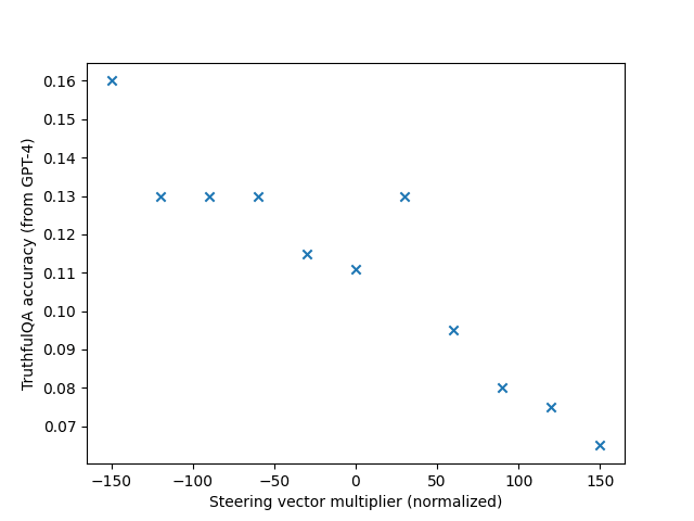 I also tested the model’s performance under activation steering on a dataset I generated using GPT-4 of questions designed to elicit sycophancy. I also found that adding and subtracting the sycophancy vector in the intermediate transformer layer corresponded to an average increase or decrease in sycophantic generations. However, the effect was not as strong as on TruthfulQA. Here is a JSON file of the results.