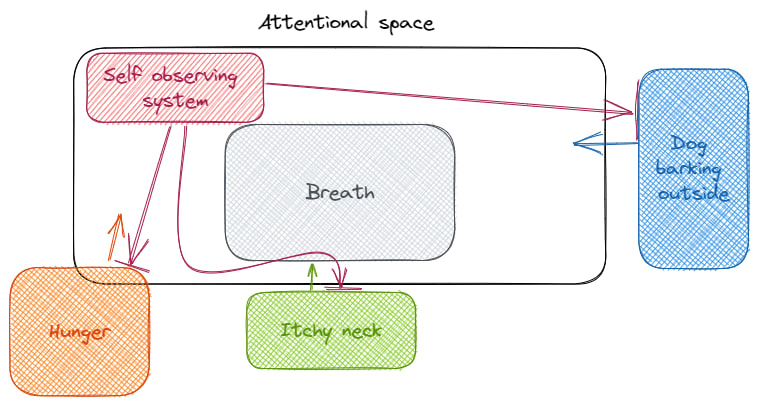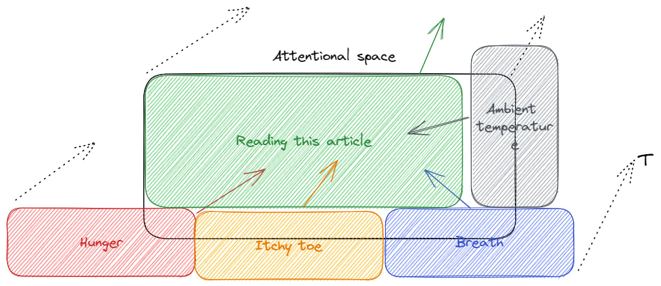 A module is then vying for your attention at a certain point in time. Examples of this in the picture are an itchy toe, hunger or your breath. The modules aren’t necessarily only sensory experiences but can also include thoughts and ideas, among any other things that can show up in your attentional space.