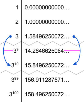 What do these long strings of digits mean? Why these numbers, in particular? We already have the tools to answer those questions, all that remains is to put them together into a visualization. In Fractional digits, we saw why it is that must be this number: The cost of a 3-digit in terms of 2-digits is more than 1 and less than 2; and the cost of ten 3-digits = one -digit in terms of 2-digits is more than 15 and less than 16, and the cost of a hundred 3-digits = one -digit in terms of 2-digits is more than 158 and less than 159, and so on. The giant number above is telling us about the entire sequence of -digit costs, for every . If we double it, we get the cost of a 9-digit in terms of 2-digits. If we triple it, we get the cost of a 27-digit in terms of 2-digits.