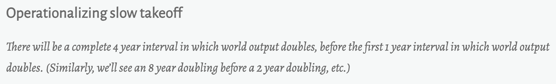 Makes sense. But on this question too I’m confused—has some evidence in the last 8 years updated you about the old takeoff speed debates? Or are you referring to claims Eliezer made about pre-takeoff rates of progress? From what I recall, the takeoff debates were mostly focused on the rate of progress we’d see given AI much more advanced than anything we have. For example, Paul Christiano operationalized slow takeoff like so: