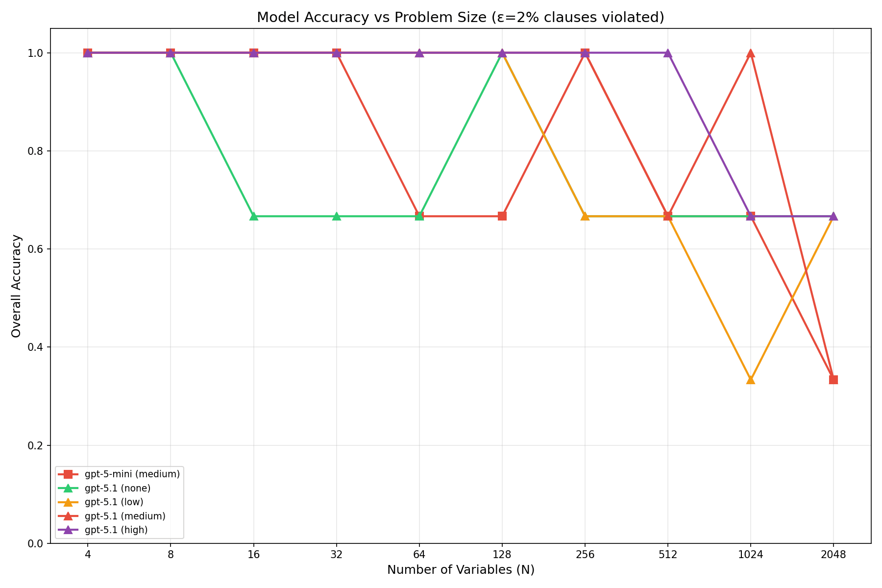 GPT5.1with no CoT, because I’m worried that humans can tamper with CoTs and that models might not be able to detect this, thus making verification in a single forward pass desirable. The CoT results can either be seen as (really weird) proxies for more intelligent models, or as an indication of what the situation would be like if models can detect CoT tampering (or if models have neuralese, and we can’t tamper with it). The experiment code is available here. The upshot of this experiment for property (3) is: while models are ok at verifying formulas for small and large , they fail for large and small .Property (1) is, unfortunately, false. For instance, this paper claims to be able to solve random planted 3SAT instances on >15K variables in a reasonable amount of time. I think that for different choices of the CSP type we should be able to get reasonably small CSPs, that even have the gap property.