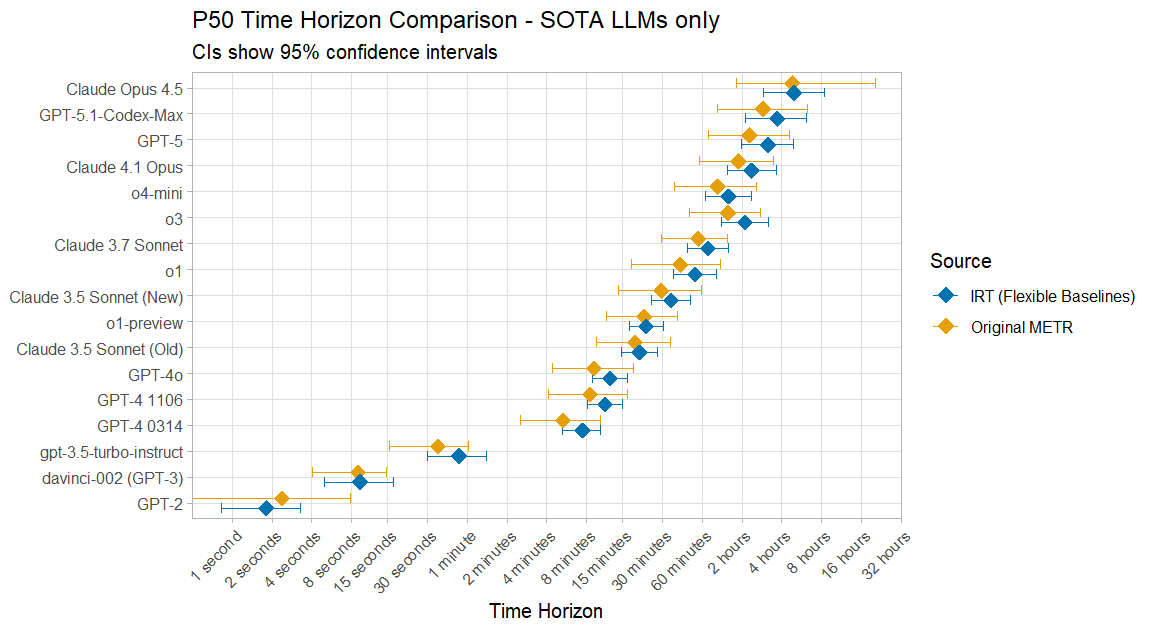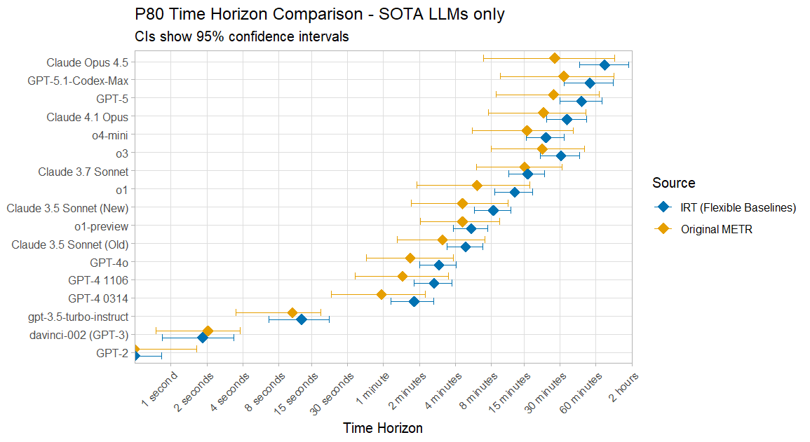 On the 80% Time Horizon results I agree that your ‘marginal’ approach is correct, and it is the one I also took in my model. However my 80% results ended up being a factor of 2 Edit:higher than the results of METR’s current model for recent SOTA LLMs. Here is a quick plot I made just after the Opus 4.5 results came out, using the TH1.0 data:I think there is some natural increase due to how my model’s data is selected however, as my 50% time horizons are also often somewhat higher, and they are mostly within uncertainty bounds anyway: