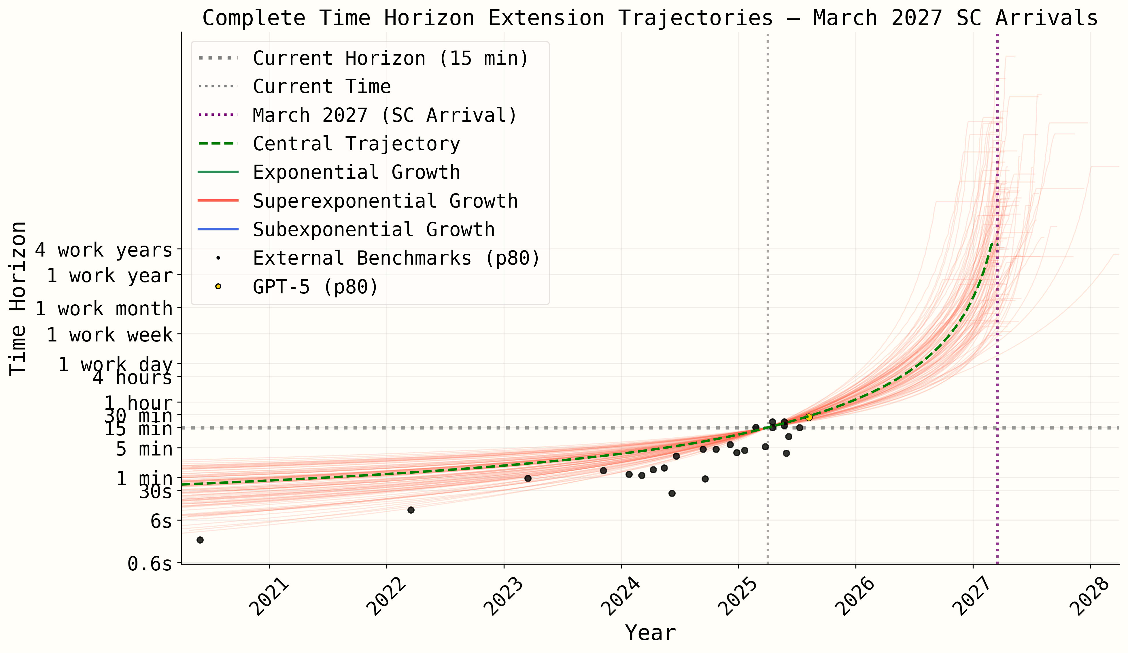 FWIW though, the central superexponential Mar 2027 trajectory from our original model certainly is not strongly contradicted by GPT-5, both with and without an AI R&D speedup interpolation issue fixed.