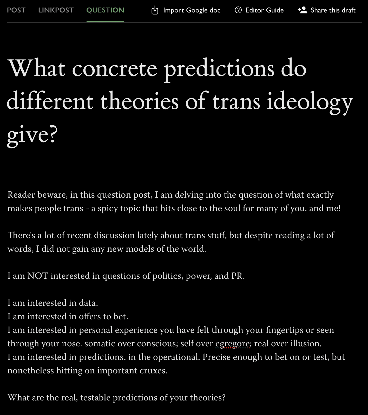 also i don’t think lw is a good place for trans discussion. like nobody even posts photos. i actually think 4chan has better transgender epistemics and terminology.