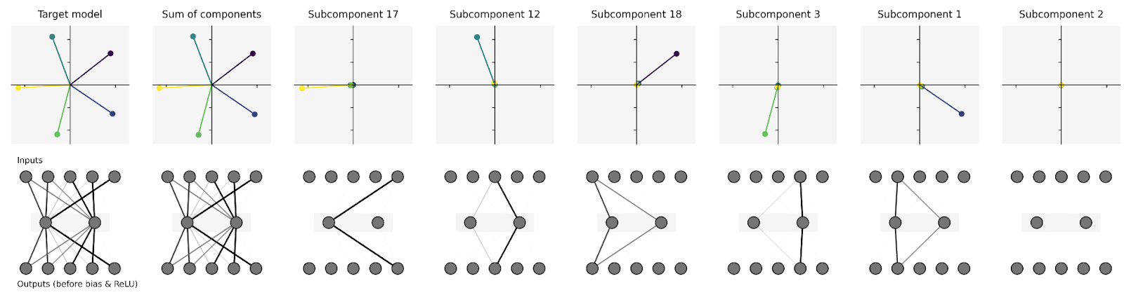 However, I find these examples extremely unsatisfactory because they only cover the trivial neuron-aligned case. When each neuron is dedicated to exactly one component (monosemantic), parameter decomposition is trivial. In realistic models, we strongly expect neurons to not be monosemantic (superposition, computation in superposition), and we don’t know whether weight linearity holds in those cases.