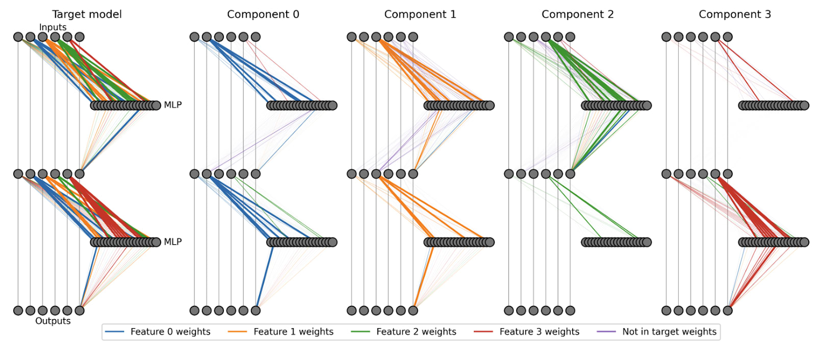 A core assumption of linear parameter decomposition methods (APD, SPD) is weight linearity. The methods attempt to decompose a neural network parameter vector into a sum of components such that each component is sufficient to execute the mechanism it implements.[1] That this is possible is a crucial and unusual assumption. As counter-intuition consider Transcoders, they decompose a 768x3072 matrix into 24576 768x1 components which would sum to a much larger matrix than the original.[2]