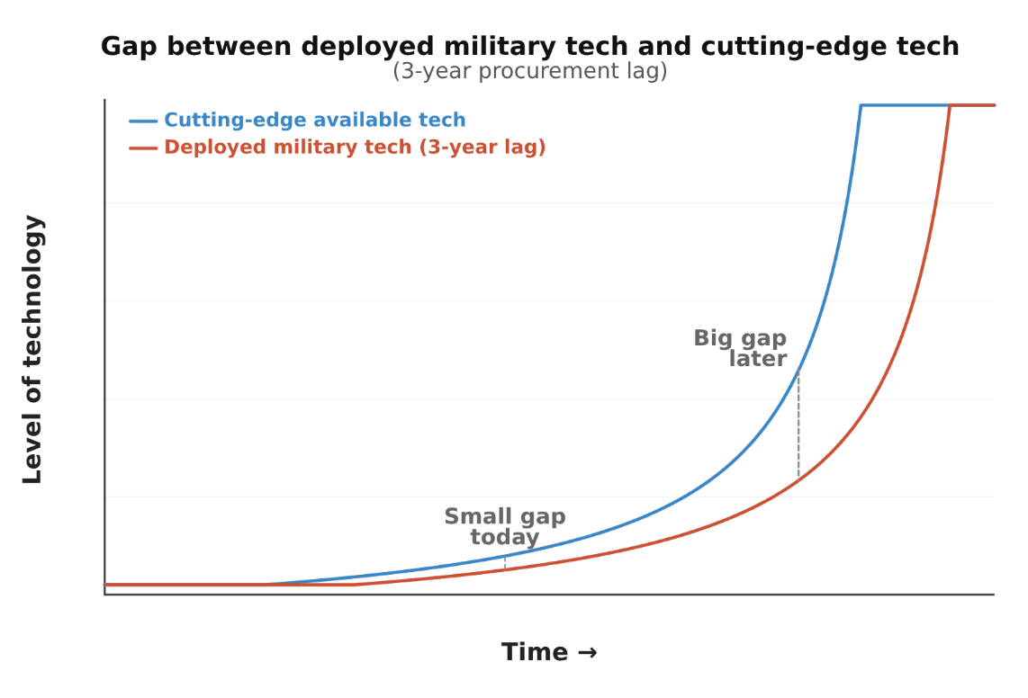 Military procurement needs to get dramatically faster during an intelligence explosion. New AI systems and AI-produced technologies need to be rapidly integrated into official military capabilities. This probably means automating the procurement process itself. This is counterintuitive from some AI safety perspectives — many people’s instinct is to delay military AI deployment.