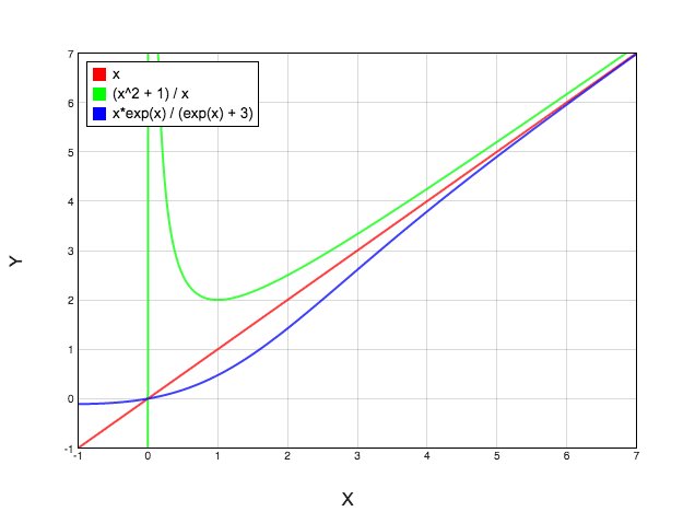 For example, as x grows large, the three functions above all start to take on the same asymptotic behavior. Asymptotic notation gives a way to express the relationship between two functions’ asymptotic behaviors.
