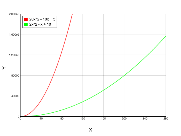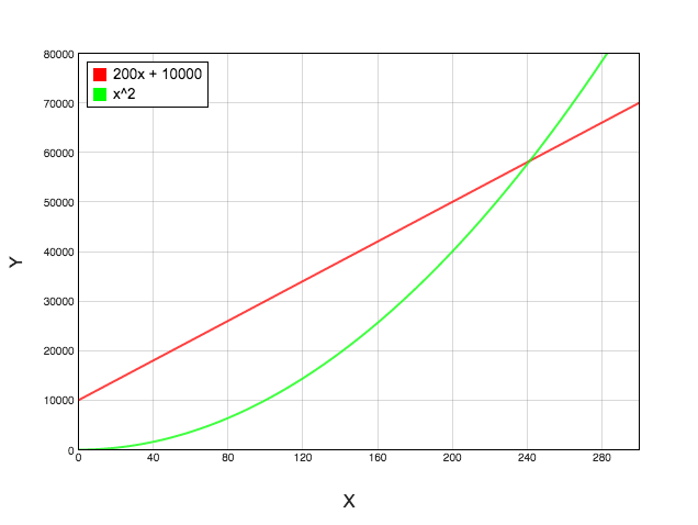 In other words will eventually overtake , no matter how much you scale by. From our first example, we showed that . This means that, no matter what you pick, will eventually be overtaken by – it’s just a matter of finding a big enough .